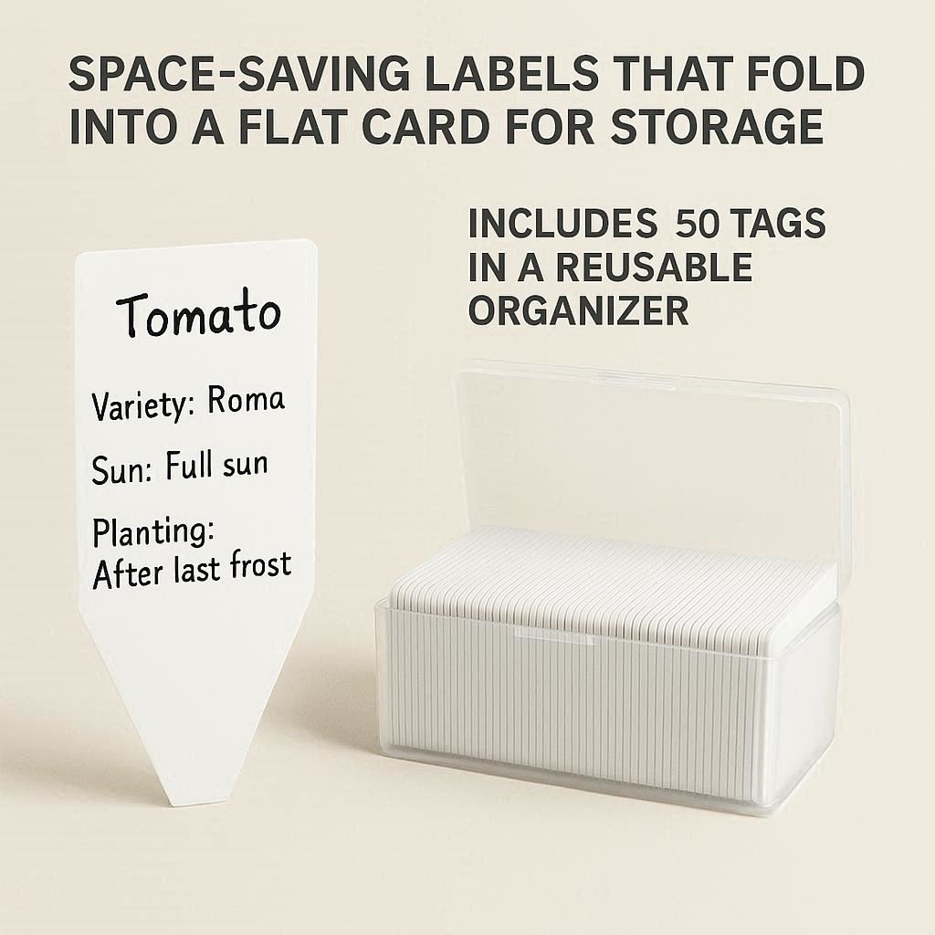 Space-saving labels that fold into a flat card for storage. Write plant details on the writable surface and unfold to stand upright. Includes 50 tags in a reusable organizer.