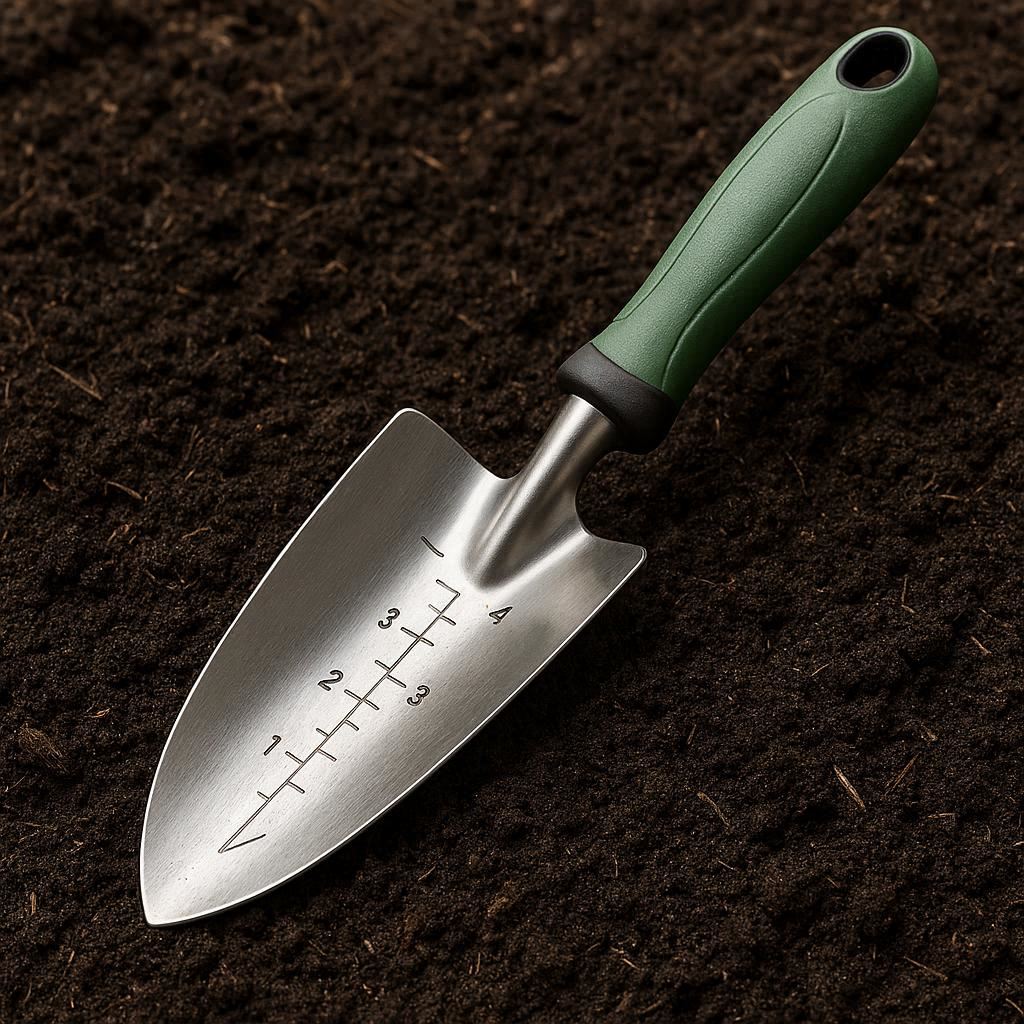 Plan your garden with precision! This trowel features inch markings on the blade for measuring planting depth and spacing. The stainless steel construction ensures durability, and the curved design aids in scooping and transferring soil.